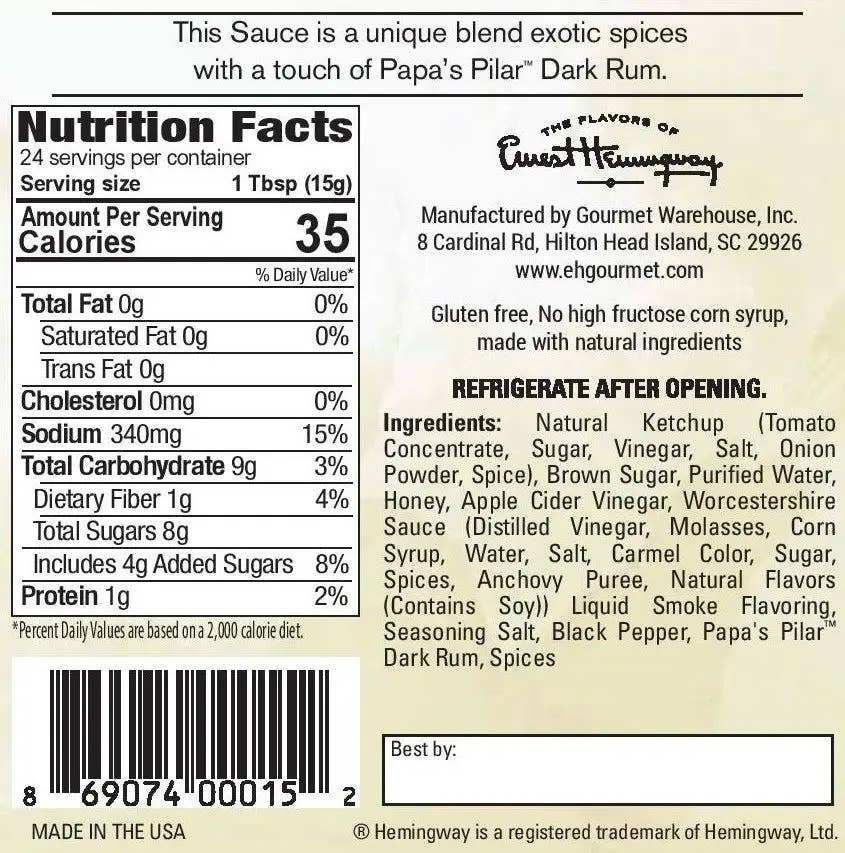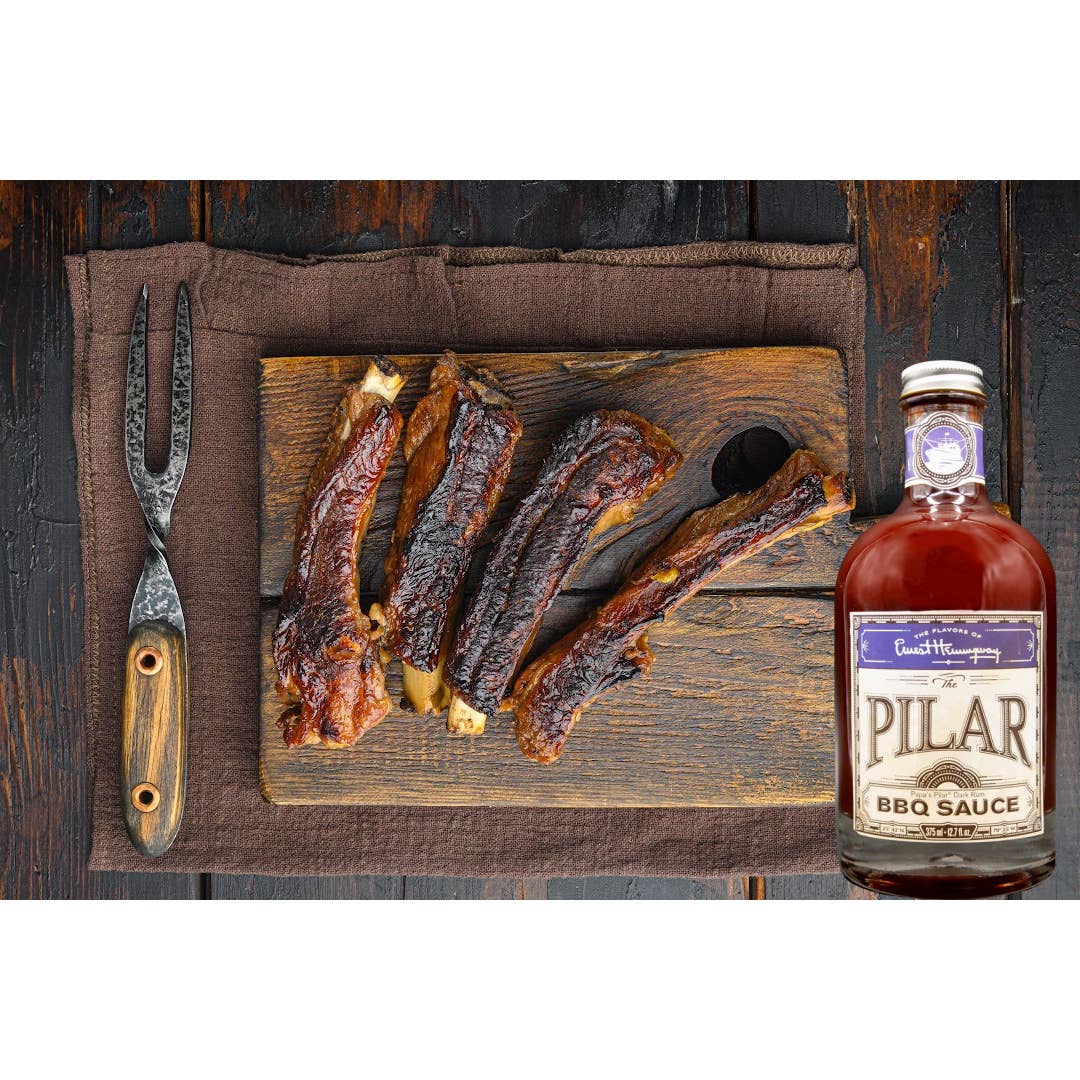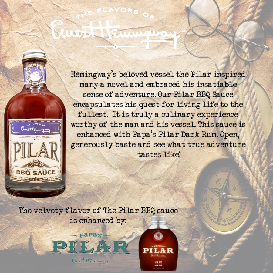 The Pilar is a deep, rich BBQ sauce infused with the essence of Papa Pilar’s Dark Rum. Inspired by Hemingway’s boundless travels on his beloved boat, "The Pilar”. This robust sauce is slightly sweet with hints of the deep, rich taste of rum. Velvety, rich and smooth. 375 ml. No High Fructose Corn Syrup.