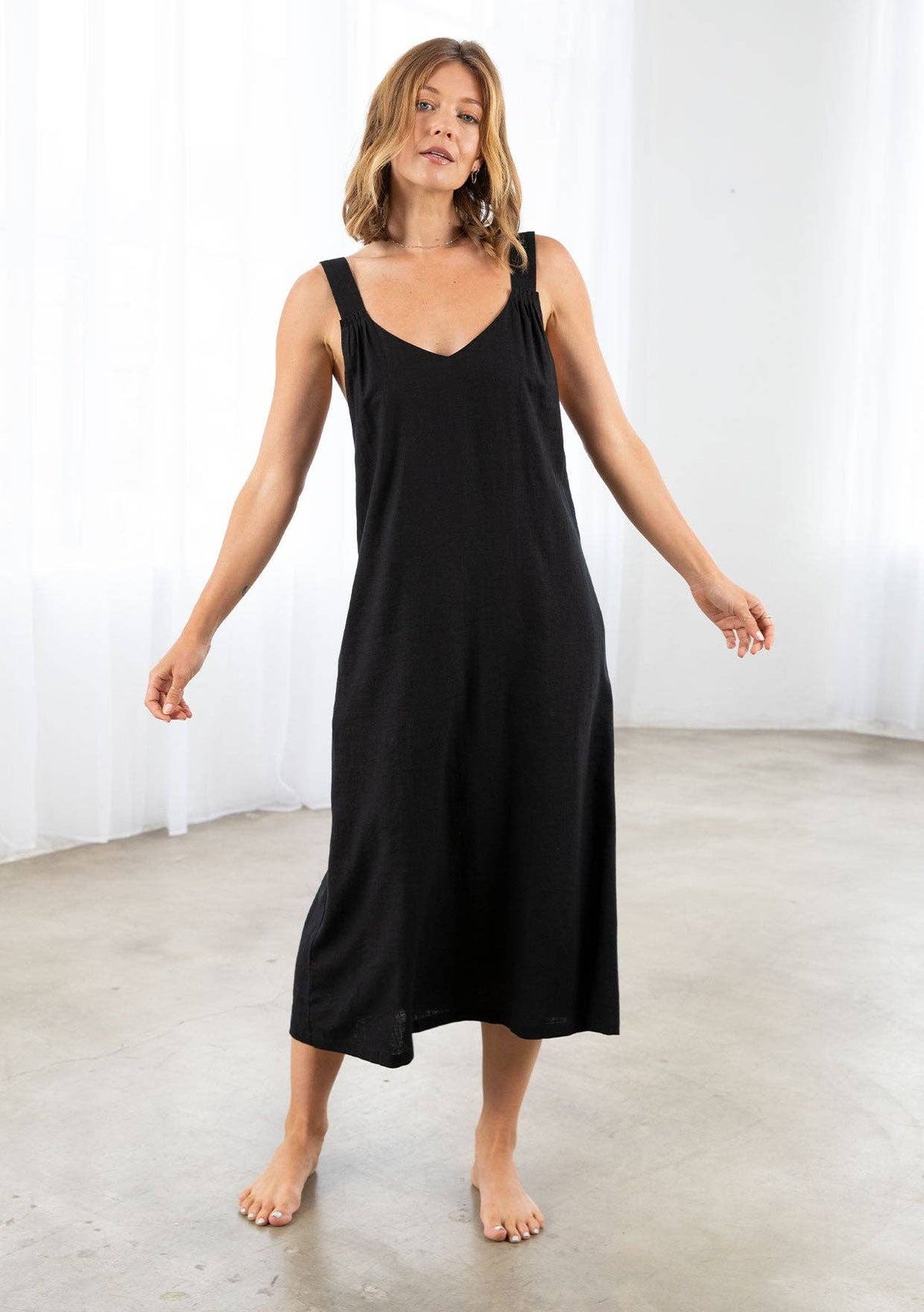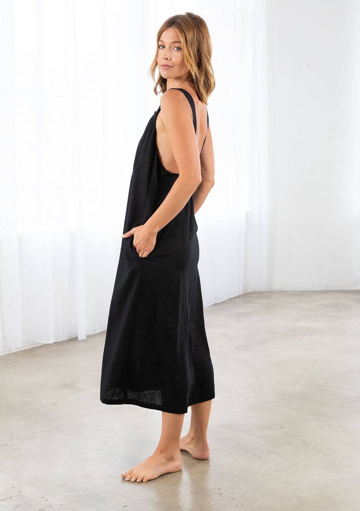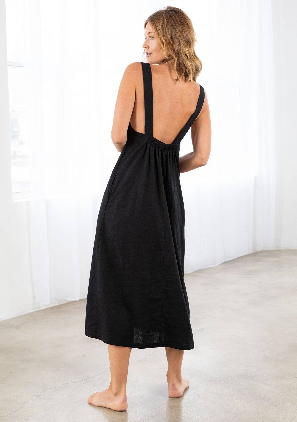 Indulge your bohemian side in our Lovely Linen Midi Dress. Crafted from a soft linen blend, this dress boasts adjustable straps, a flattering v-neckline, and a breezy drop back. With the addition of two handy side pockets and a loose, easy fit, you'll want to wear this piece everywhere.
