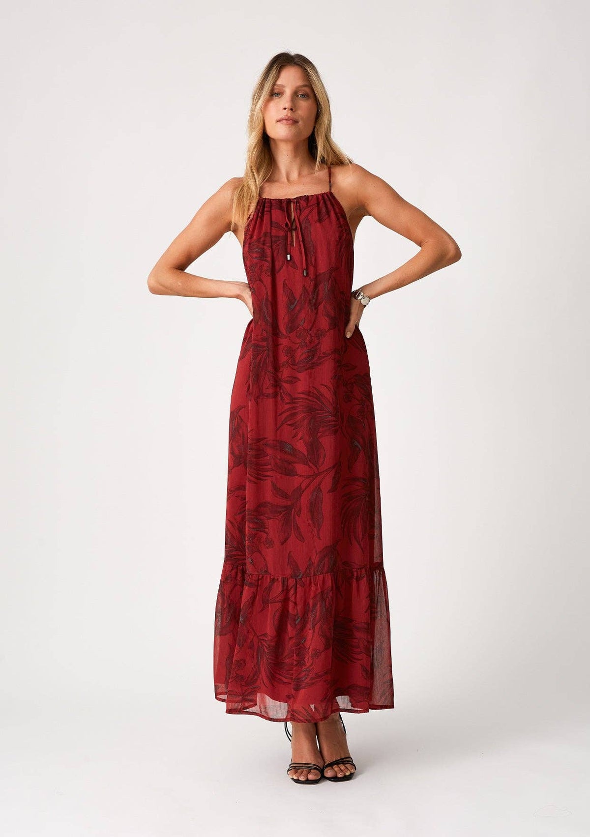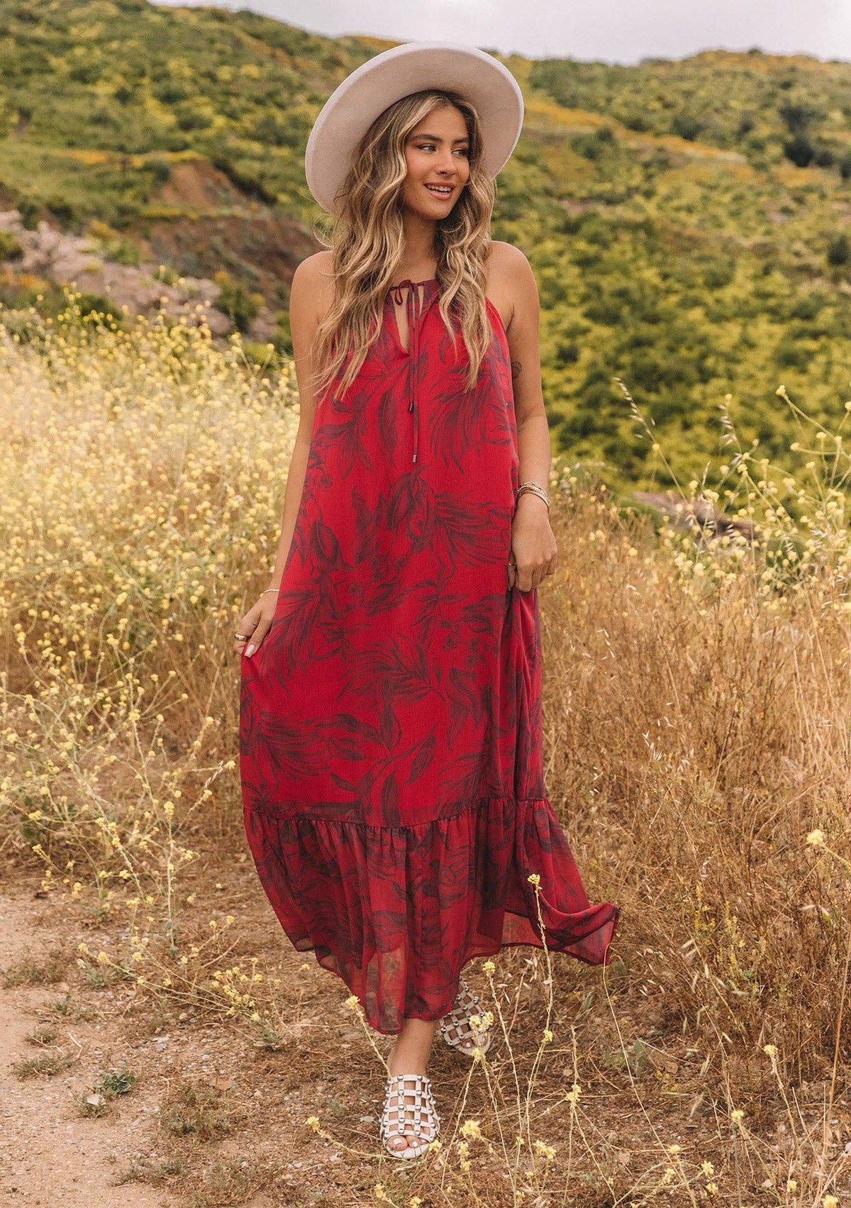 Elevate your Fall style with our Roja Maxi Dress. This flowy floral dress features a halter neckline, tie neck, and ruffle-trimmed hem, making it the perfect choice for any occasion. With its comfortable fit and elegant design, this dress will surely become a staple in your wardrobe.