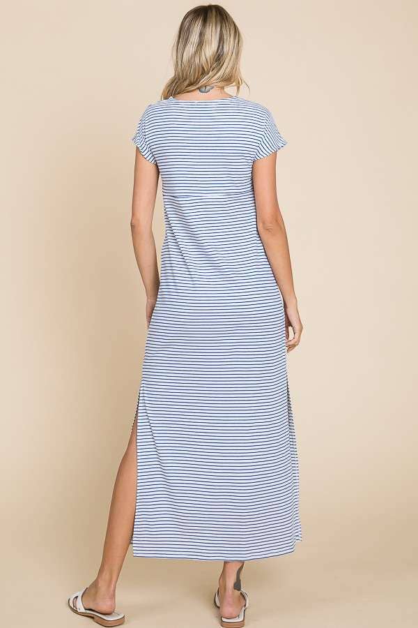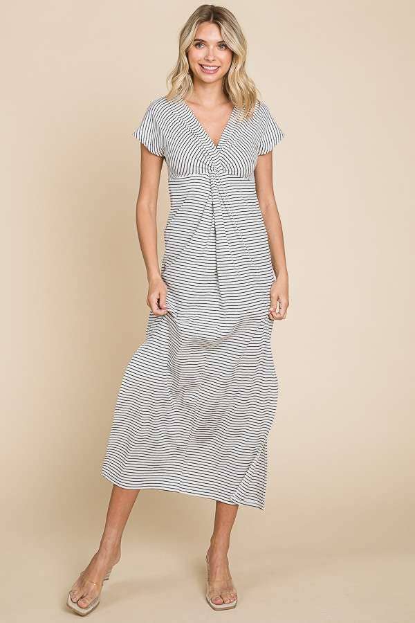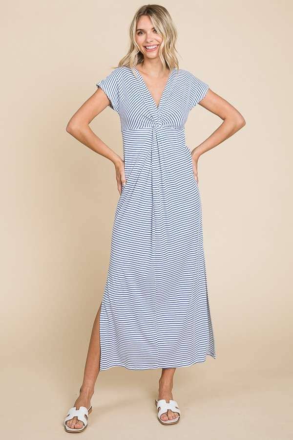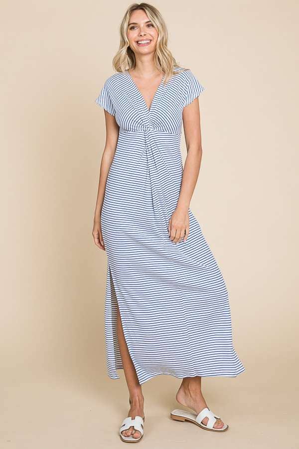 Elevate your beach look with the Cabana Days Maxi Striped Dress. Crafted from rib fabric, this dress features a unique twist detail that adds dimension and style. Perfect for lounging or strolling along the shore, this maxi dress is a must-have for your sunny day wardrobe.